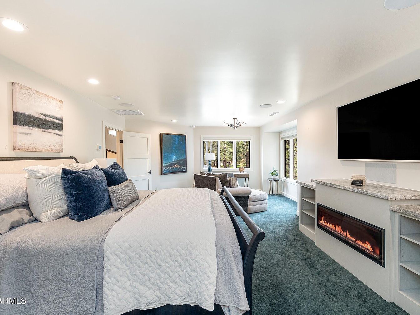 This spacious master bedroom features a tranquil and modern design accentuated by clean, white walls and ceiling that enhance natural light. A large bed with a neutral quilt and plush navy and gray pillows anchors the space. Opposite the bed, a sleek built-in fireplace with a granite countertop adds warmth and luxury beneath a mounted flat-screen TV. The room extends to a cozy sitting area with a soft beige armchair and ottoman next to large windows offering a peaceful forest view. The deep teal carpet complements the overall serene color palette, creating a comfortable retreat.