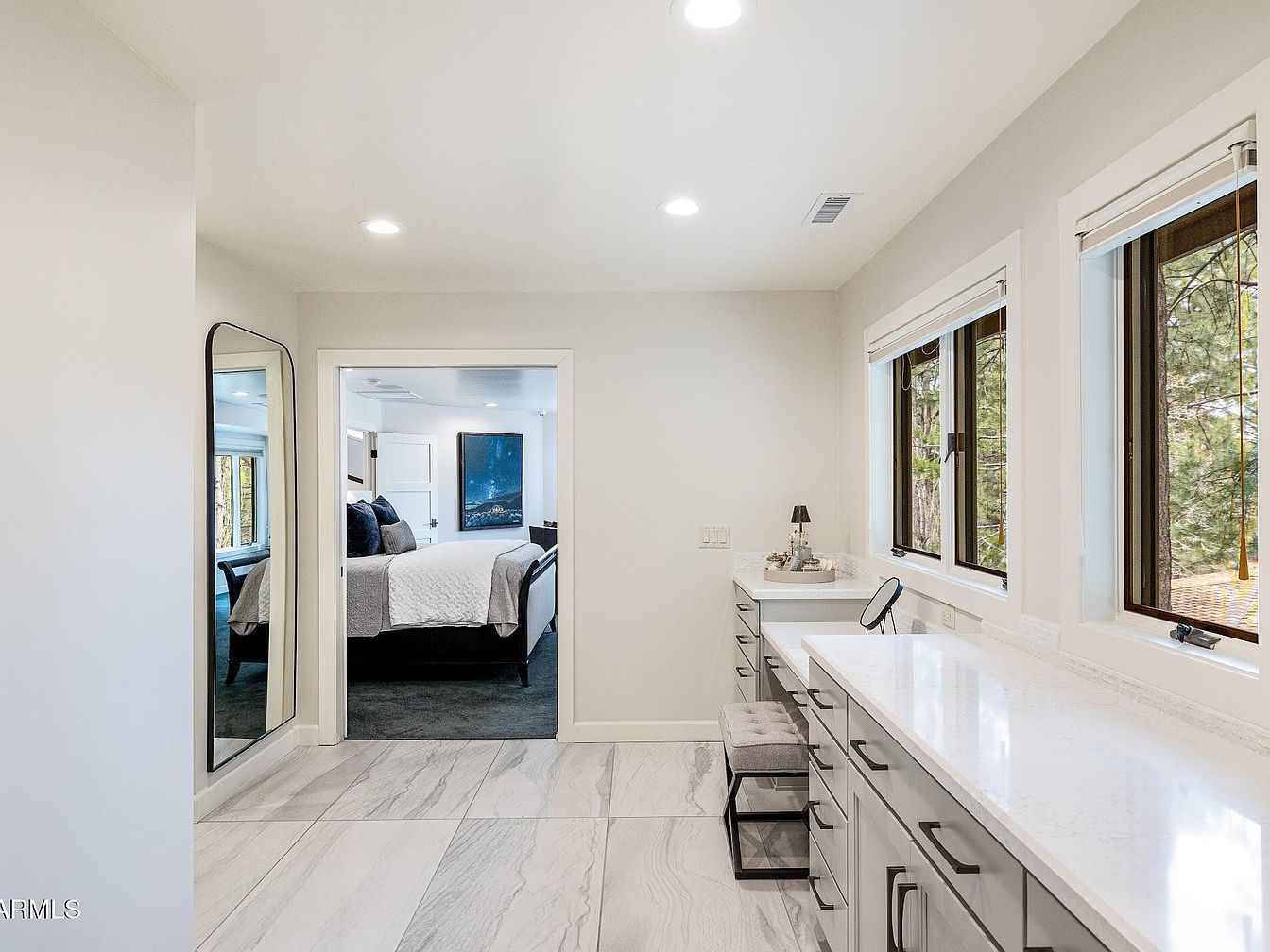 This bright, airy dressing area features a sleek white vanity with extensive drawer storage and a long, polished countertop illuminated by natural light streaming through three large windows. The white walls and ceiling create a clean, minimalist feel, while the light gray veined tile floor adds subtle texture and elegance. A tufted bench adds comfort at the vanity, complemented by a small tabletop mirror and decorative items. A tall, black-framed floor mirror stands by the entryway, reflecting a glimpse of the adjoining bedroom, which has a darker carpeted floor and cozy bedding, creating a balanced contrast within this serene space.