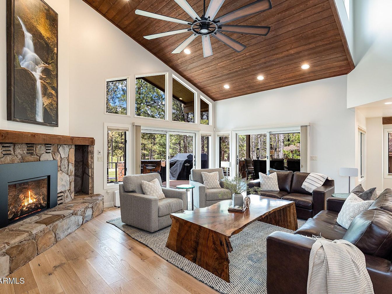This spacious living room features a vaulted wooden ceiling with recessed lighting and a large rustic ceiling fan, contributing to a cozy, lodge-like atmosphere. Floor-to-ceiling windows and sliding glass doors provide abundant natural light and picturesque views of the surrounding greenery. The stone fireplace with a wooden mantel is a focal point, enhancing warmth and character. Seating includes two gray armchairs and two dark leather sofas, arranged around a striking live-edge wooden coffee table atop a neutral textured rug. The neutral color palette blends soft grays, browns, and natural wood tones for a harmonious, inviting space.