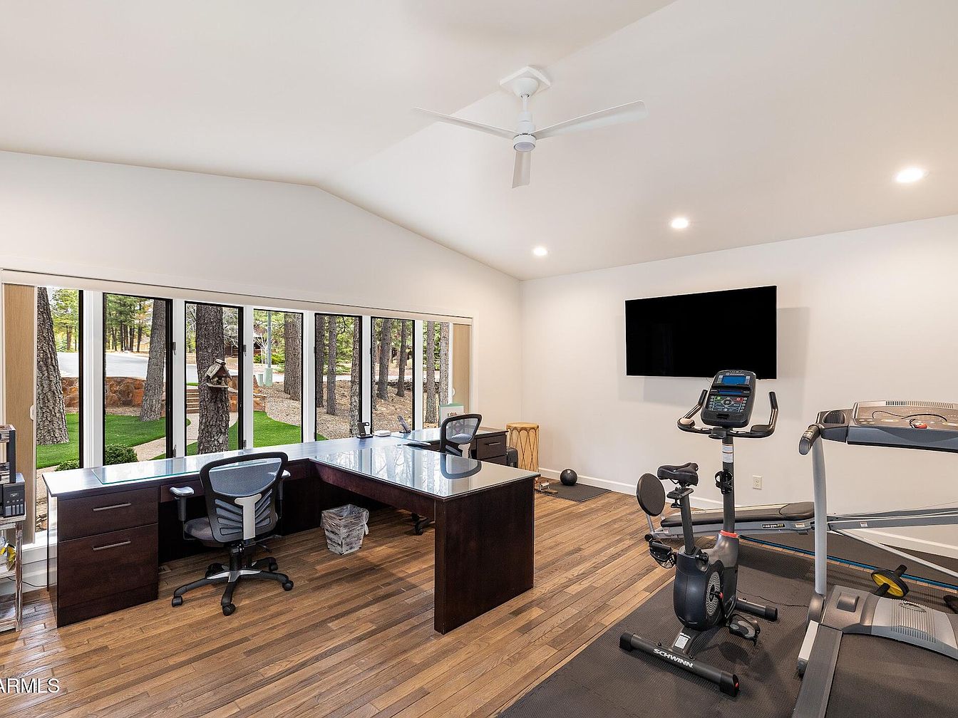 This spacious multi-functional room blends a professional home office setup with a personal workout space. The office area features a sleek L-shaped dark wood desk with a smooth, reflective surface, paired with ergonomic black mesh chairs. Floor-to-ceiling sliding windows provide abundant natural light and a refreshing view of tall pine trees outside, enhancing focus and relaxation. The room’s hardwood floors add warmth, contrasting stylishly with the crisp white walls and vaulted ceiling fitted with a modern white ceiling fan. A wall-mounted flat screen TV anchors the gym equipment, which includes a stationary bike, treadmill, and essential workout accessories on a black mat, all arranged to maximize space and usability.