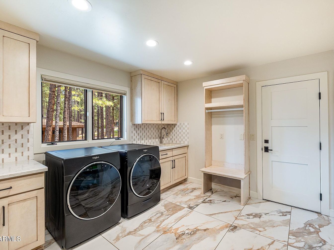 This spacious laundry room boasts sleek black front-loading washer and dryer units set against light wood cabinetry that offers ample storage. The room is brightened naturally by a large window framing a serene view of tall pine trees. Light beige walls and matching cabinetry create a warm, neutral palette, while the polished marble floor tiles add elegance with their cream, gray, and soft brown veining. Recessed ceiling lights provide bright illumination. A built-in storage bench with a hanging rod stands beside a white paneled door, providing functionality and organized entryway convenience within this clean, well-appointed space.