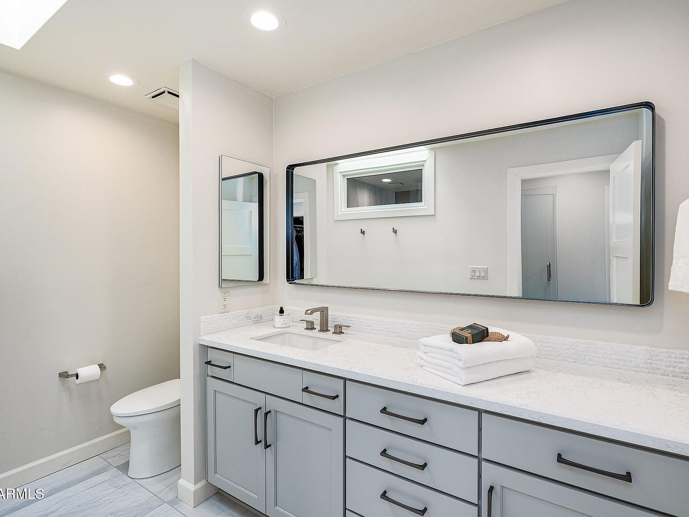 This bathroom features a modern, clean design with a spacious vanity countertop in white quartz that complements the light gray cabinetry below. The cabinets have sleek black hardware, adding a subtle contrast to the soft color palette. Above, an expansive rectangular mirror with rounded edges and a thin black frame enhances the sense of space and light. The walls are painted a soft, neutral tone with recessed lighting overhead providing bright, even illumination. To the left, a toilet is tucked neatly into a separate nook, maintaining privacy while keeping the overall look uncluttered and streamlined.