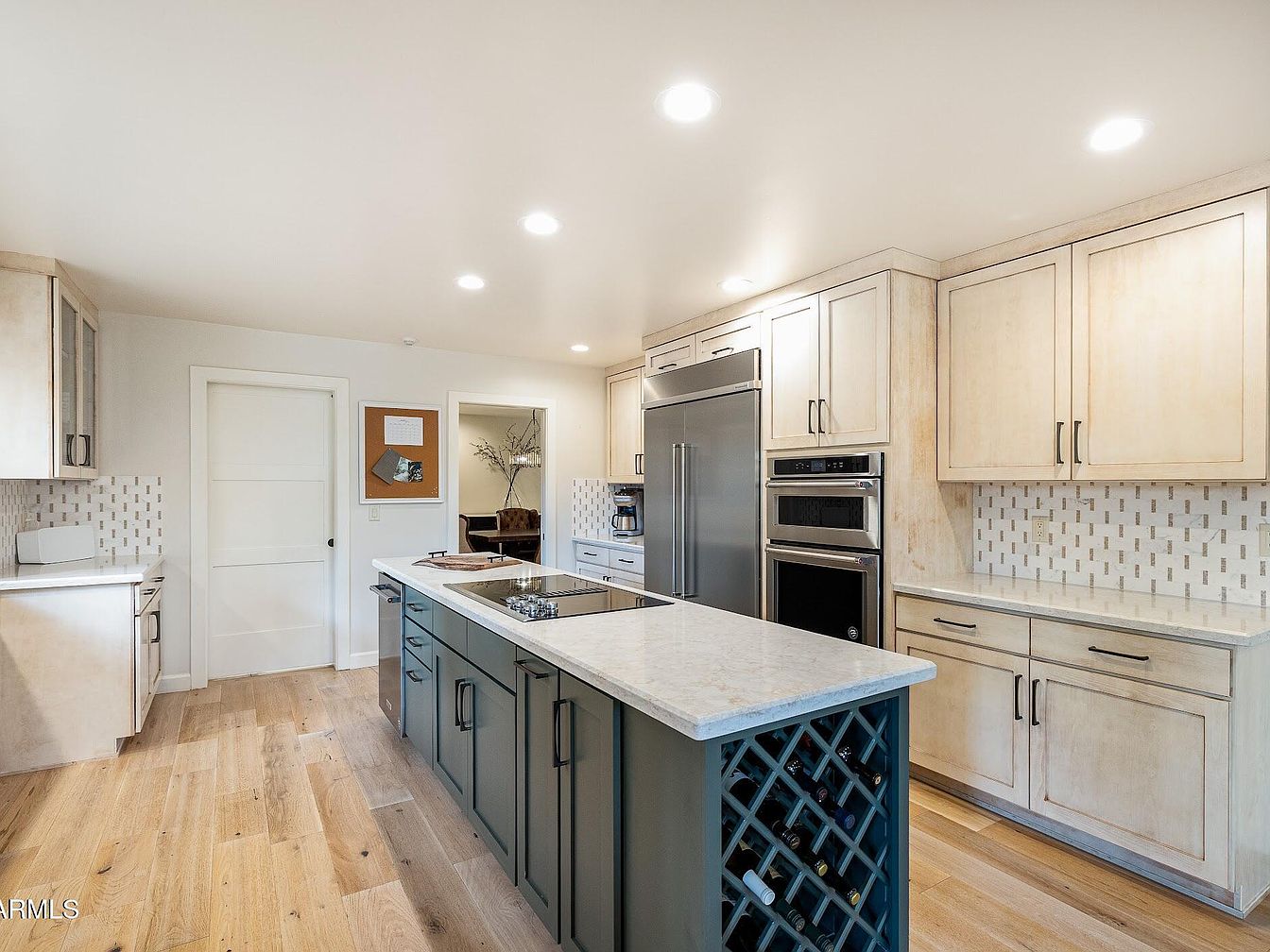 This spacious kitchen features a long central island with a smooth white countertop contrasted by a deep blue base that includes built-in wine storage on one end. Light wooden cabinetry lines the walls, paired with subtle patterned backsplash tiles and black hardware for a modern yet warm aesthetic. The flooring is a natural wood tone that complements the cabinetry, while recessed ceiling lights provide bright, even lighting throughout. Stainless steel appliances, including a large refrigerator and double ovens, add sleek functionality. A doorway at the back leads to an adjoining room with additional seating and decor.