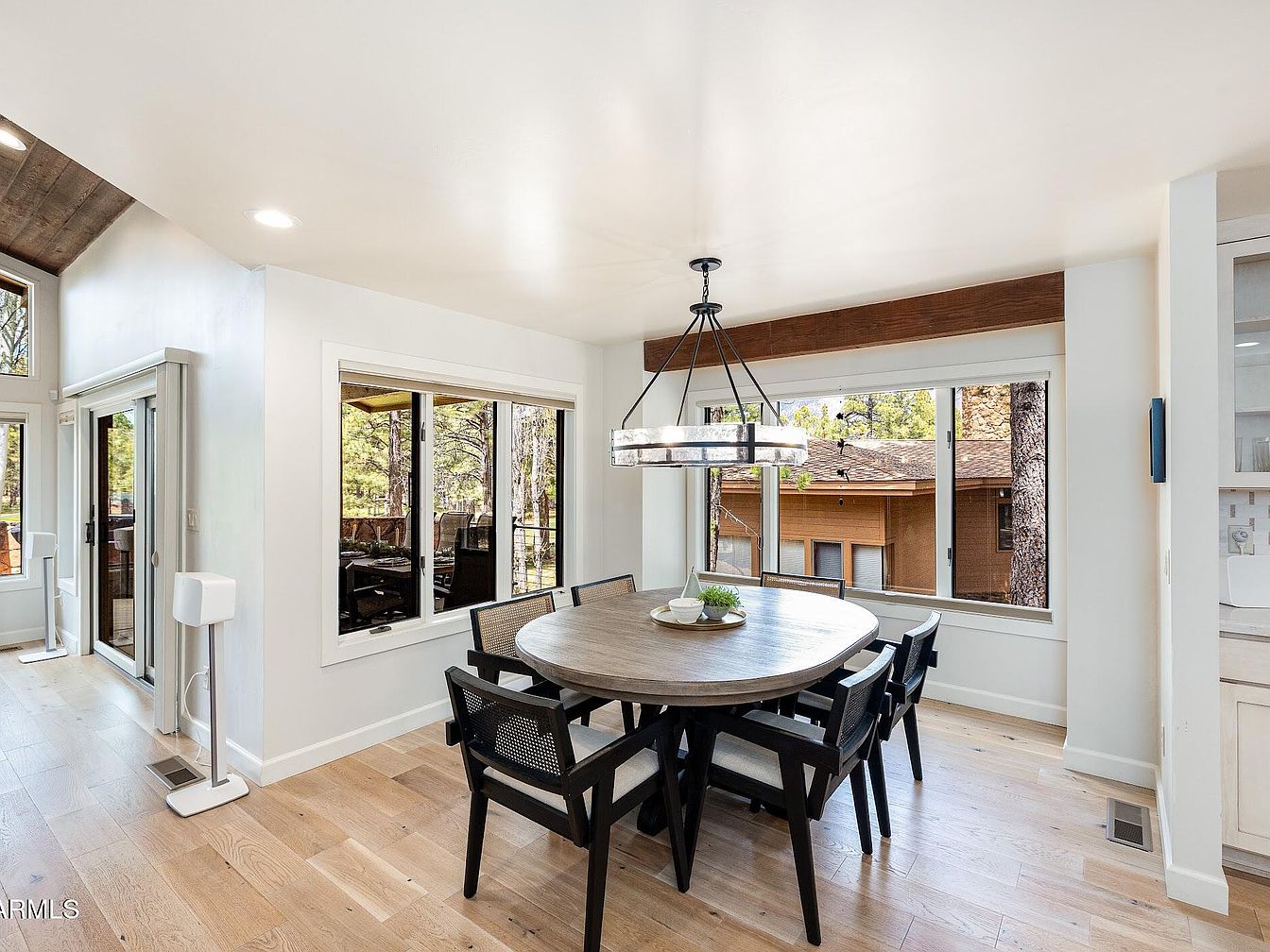 This dining space features a round wooden table with a natural finish, surrounded by six black chairs with cane backs and light cushions, balancing comfort and style. Large windows wrap around two walls, flooding the room with natural light and offering a serene view of the wooded surroundings. The flooring is light hardwood, adding warmth and continuity throughout the space. A modern, circular chandelier with glass elements hangs directly above the table, creating a focal point while providing ample lighting. White walls and ceiling keep the room bright and airy, complemented by a dark wooden beam above the windows adding rustic charm.