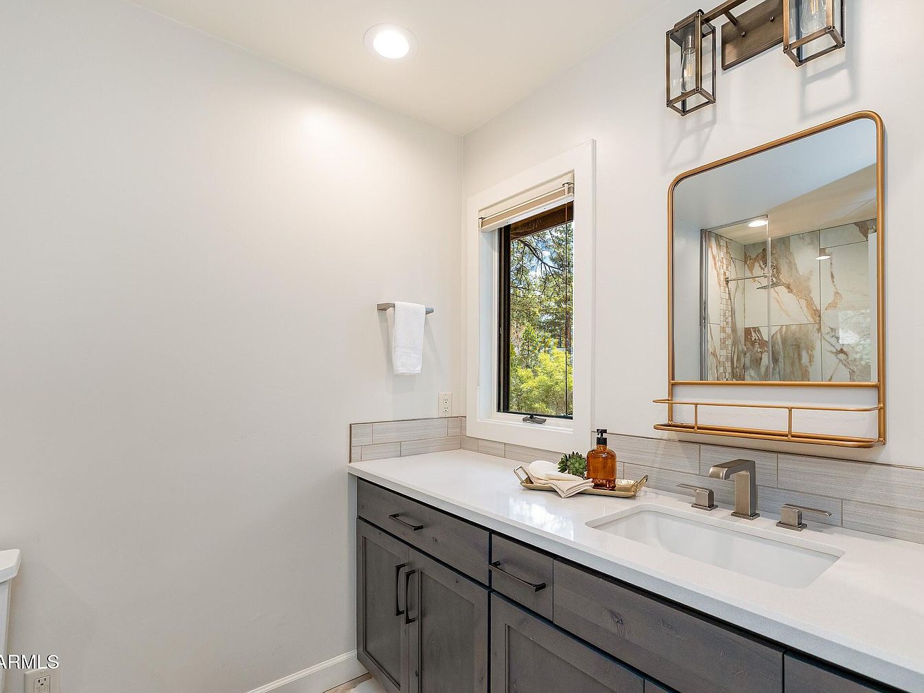 This bathroom features a sleek vanity with a white countertop and undermount sink, complemented by matte black cabinetry that adds a modern touch. A rectangular mirror framed in brass with a built-in shelf hangs above the sink, reflecting a tiled shower area with earthy, marble-like patterns. Soft grey subway tiles serve as a backsplash, linking the space visually. Recessed lighting overhead illuminates the space, while a small window next to the vanity offers natural light and a view of greenery outside. The decor includes elegant geometric light fixtures and minimal countertop accessories, emphasizing clean lines and subtle warmth.
