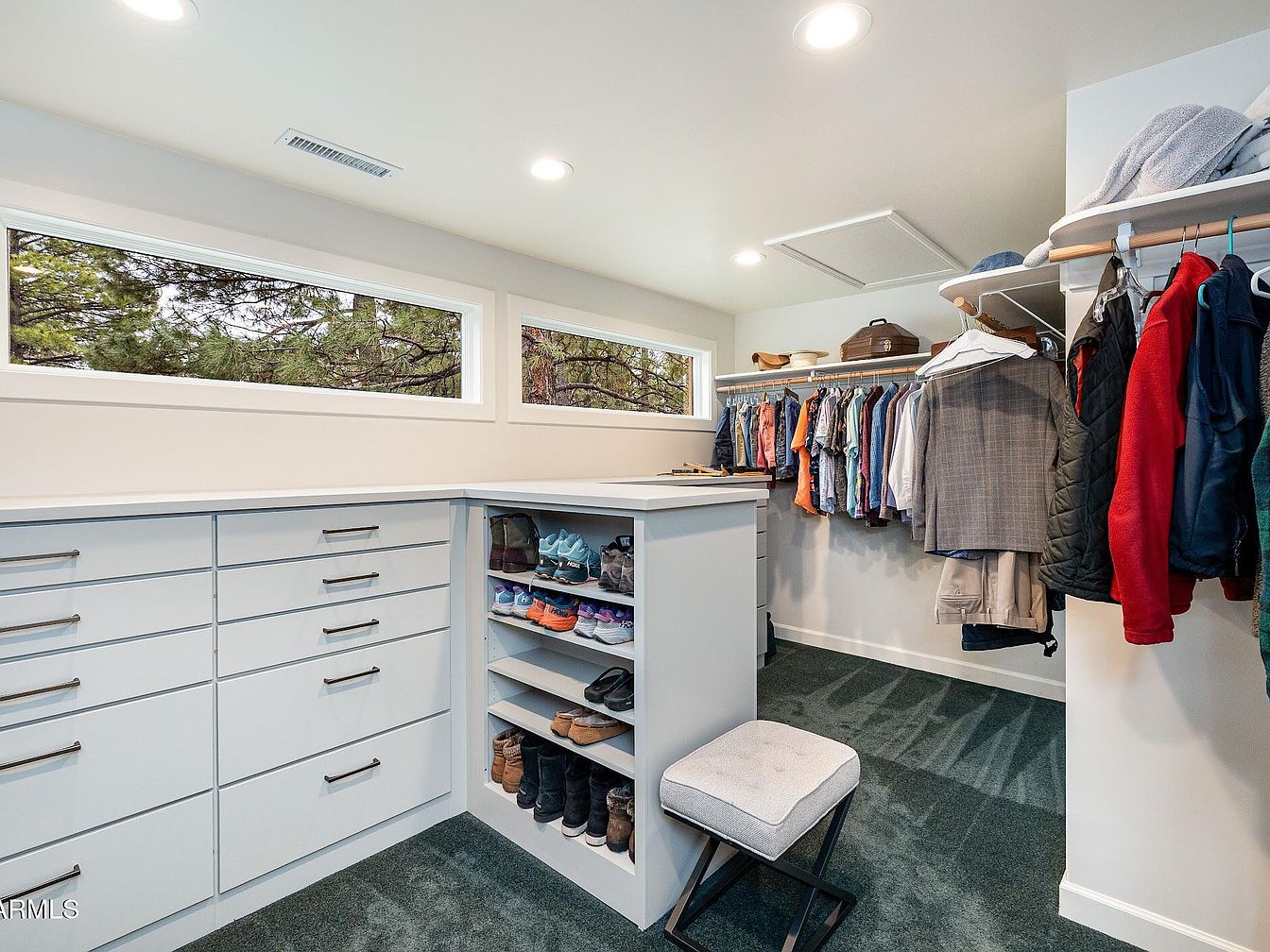 This spacious walk-in closet features clean, white cabinetry with sleek modern handles, offering abundant drawer storage. A built-in shoe rack is centrally located underneath a countertop, providing easy access and organization for footwear. Above, two narrow horizontal windows allow natural light to filter in, while maintaining privacy. The green carpet adds a subtle touch of color and softness underfoot. Clothes are neatly hung on wooden rods lining one side, with items ranging from casual to formal wear. A small, cushioned stool with black metal legs adds functionality and style to the room’s overall minimalist, organized aesthetic.