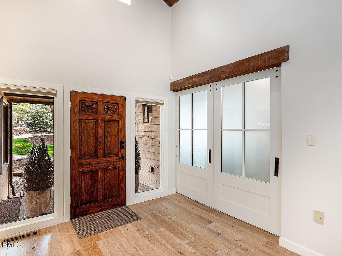 This welcoming entryway features a rich, carved wooden front door flanked by large, clear sidelights that invite natural light inside, creating an open, airy feel. The floors are finished in light-toned hardwood, contributing warmth and a natural texture. Adjacent to the door, white sliding barn-style doors with frosted glass panels provide a modern, rustic contrast, accentuated by a bold wooden header beam above. The bright walls and high ceiling enhance the spaciousness, making the space feel fresh and inviting. The layout balances traditional craftsmanship with contemporary design elements, blending functionality with aesthetic appeal.