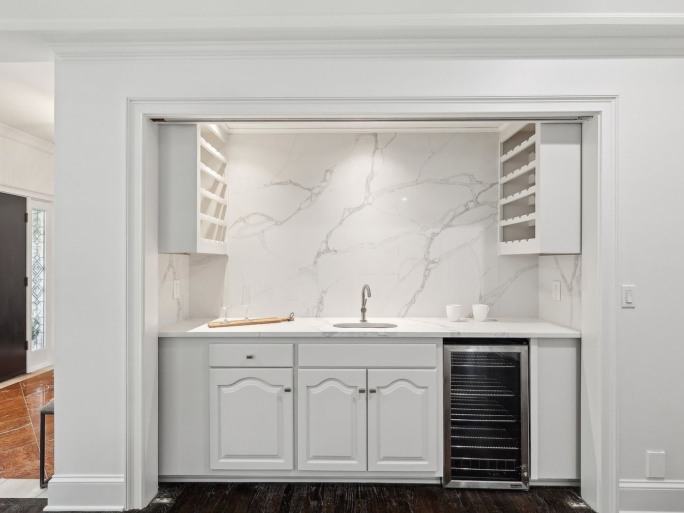 This sleek wet bar features a clean, minimalistic design with a crisp white palette accented by subtle gray veining on the marble backsplash and countertop, creating an elegant highlight. The cabinetry is traditional with raised panel doors and small, modern square knobs, blending contemporary and classic styles. Open shelves on either side provide storage for bottles or glassware, while a compact under-counter beverage fridge adds convenience. The small, brushed nickel faucet and integrated sink offer functionality without disrupting the streamlined look. Dark hardwood floors contrast the white surroundings, grounding the space with warmth and depth.
