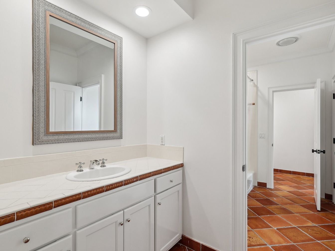 This bathroom vanity area features a clean, neutral color palette with white walls and cabinetry, creating a fresh and bright ambiance. The countertop is white tile bordered with earthy brown decorative tiles that match the terracotta floor seen continuing beyond the doorway. A large, intricately patterned mirror with subtle metallic and wooden accents hangs above the white ceramic sink, adding texture and visual interest. The cabinetry below provides ample storage, while the recessed lighting overhead ensures the space is well illuminated. The open doorway reveals more terracotta tile flooring leading to another white-walled room, blending classic and rustic elements.