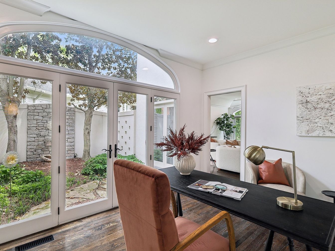 This cozy home office features a sleek black desk paired with a cushioned, rust-colored chair that adds warmth to the space. A modern brass desk lamp and a white textured vase filled with deep red foliage sit atop the desk, creating a refined workspace. The room boasts crisp white walls and crown molding, enhancing its clean, sophisticated feel. Large French doors with an arched transom window flood the room with natural light and provide a serene view of the garden outside, framed by lush greenery and a stone wall. Through an open doorway, a glimpse of a white, plush seating area with neutral and rust-toned pillows invites relaxation.