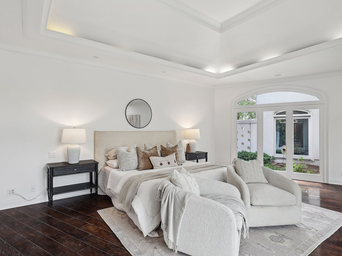 This spacious master bedroom features a tranquil color palette dominated by soft whites and warm neutrals, complemented by deep, rich wood flooring. The high ceiling with layered molding accentuates openness, enhanced by recessed lighting creating a soft glow. The bed is centered with an upholstered headboard flanked by black nightstands topped with textured white lamps. Plush, textured armchairs with throw blankets face the bed, resting on a large, patterned area rug. The room is anchored by expansive glass doors with an arched transom, inviting natural light and offering a serene courtyard view that integrates indoor and outdoor living.