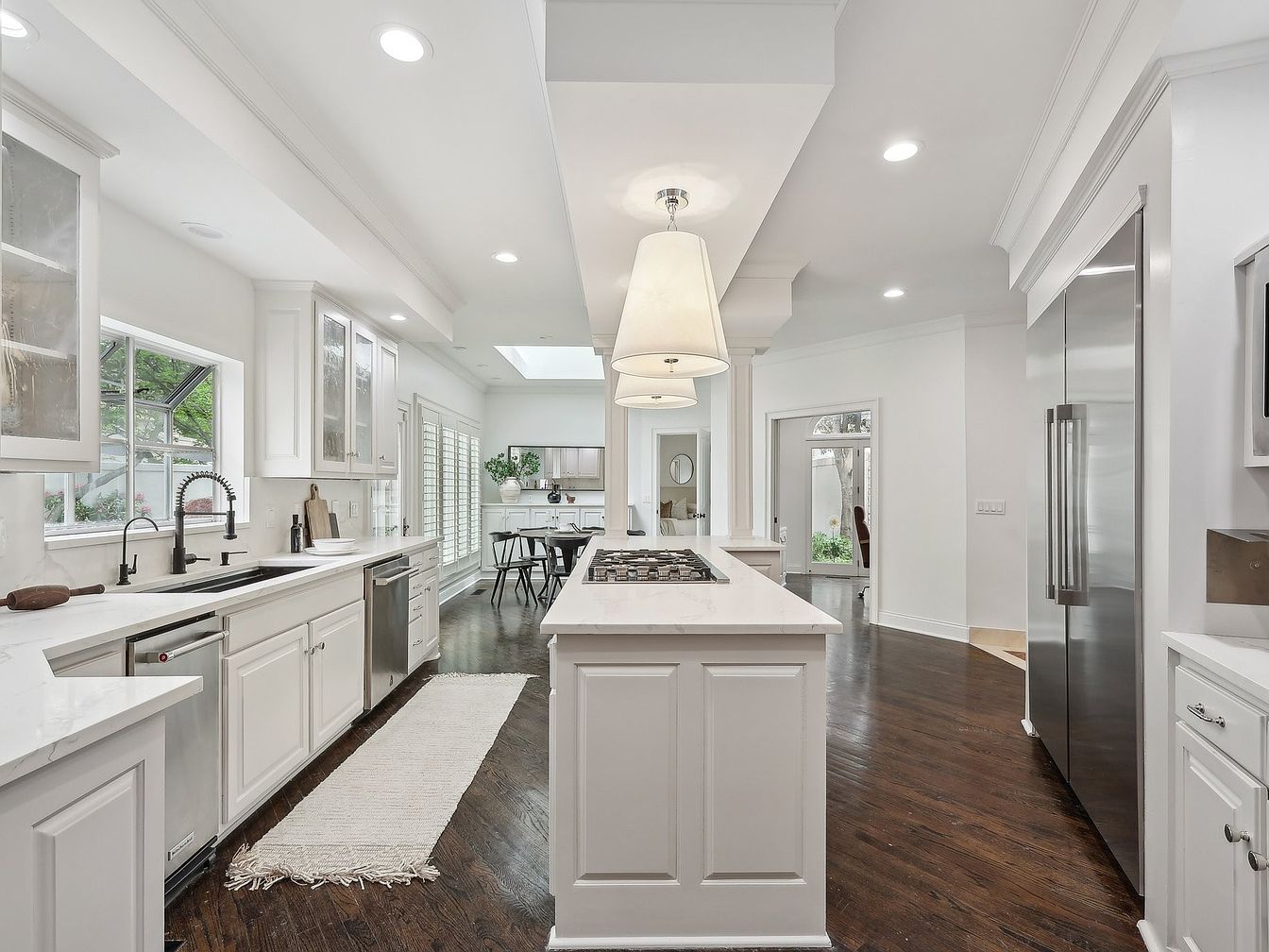 This kitchen features a bright and spacious layout with classic white cabinetry and smooth marble countertops, creating a clean and timeless aesthetic. A central island with a built-in cooktop anchors the space, illuminated by large pendant lights hanging from a recessed ceiling with crown molding. Dark hardwood floors provide a rich contrast to the predominantly white color scheme. Stainless steel appliances, including a refrigerator and dishwasher, enhance the modern functionality. A long white runner rug softens the wooden floor. Paneled glass cabinets and a large window with white plantation shutters bring in natural light, connecting to a cozy breakfast nook with black chairs and a wooden table near the back.