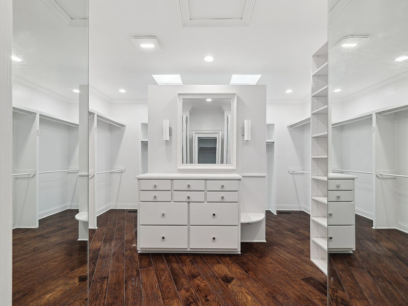 This spacious walk-in closet features a bright and clean layout with pristine white walls, trim, and cabinetry that create an airy and organized atmosphere. Dark wood flooring offers a beautiful contrast, grounding the space with warmth and richness. The central island has multiple drawers and cabinets for ample storage, topped with a large mirror flanked by minimalist wall sconces. Surrounding the island, open shelving and hanging rods span the perimeter, maximizing functionality. Recessed lights and ceiling skylights enhance natural and artificial illumination, contributing to the fresh, modern aesthetic.