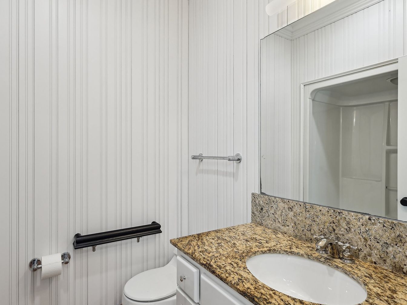 This bathroom features a compact layout with a white toilet positioned near a granite countertop vanity. The countertop has a polished, speckled pattern in warm earth tones, complementing the predominantly white beadboard panel walls that add texture and a cottage-style charm. A large mirror above the sink reflects the adjacent shower area, which includes a white fiberglass enclosure. Polished chrome fixtures, including a dual-handle faucet, a towel bar, and a toilet paper holder, add subtle metallic accents. The overall aesthetic is clean, functional, and inviting with a focus on neutral, natural materials.