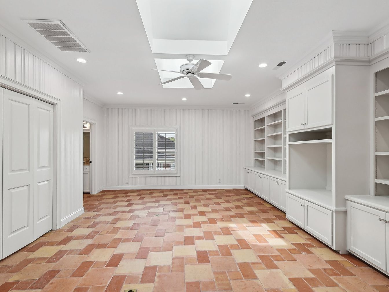This spacious bonus room presents a balance between functionality and bright simplicity. The terracotta and cream-toned tile floor adds warmth and an inviting rustic touch, complementing the otherwise crisp and clean white palette that dominates the walls, ceiling, and cabinetry. From the ceiling, a white ceiling fan hangs centrally beneath recessed lighting and a coffered roof detail, allowing for both style and ventilation. One wall boasts extensive white built-in shelving and cabinets, offering ample storage and display space. A single window with white shutters provides natural light and a view to the exterior, enhancing the airy, open feeling of the room.