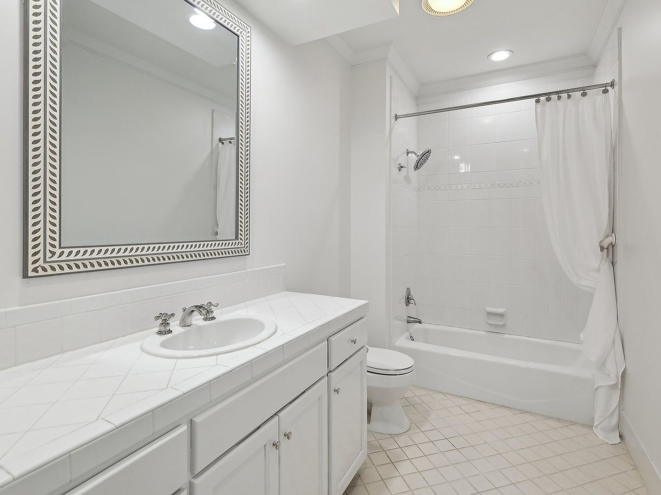 This guest bathroom embraces a clean, minimalist design with a predominance of white tones. The vanity is topped with white ceramic tiles laid in a diagonal pattern, complementing the white cabinetry below, which offers ample storage with its multiple doors and drawers. A large, decorative mirror framed with a subtle leaf motif adds a touch of elegance above the sink. The bathtub, featuring a tiled surround, has a simple chrome showerhead and a white shower curtain pulled to one side. The floor is accented by square white tiles, with recessed lighting brightening the space for a fresh and spacious feel.