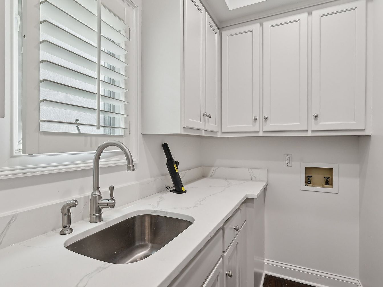 This compact laundry area features a clean, white color scheme with sleek cabinetry overhead providing ample storage. A modern, stainless steel sink is inset into a white marble-effect countertop, accented with subtle gray veining, creating a bright and elegant workspace. The single-handle faucet and matching soap dispenser maintain a minimalist feel. Horizontal window shutters fill the space with natural light while preserving privacy. There is a designated alcove on the wall for washer and dryer hookups, emphasizing functionality without compromising the room’s streamlined design.