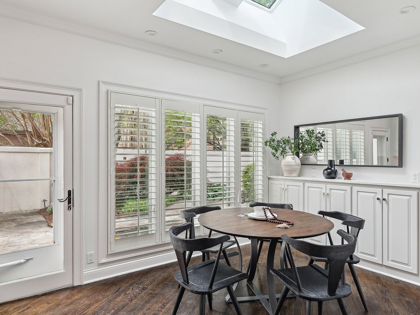 This cozy dining space features a round wooden table paired with four modern black chairs, providing an inviting spot for meals. The room is bathed in natural light thanks to a large skylight above and a wide set of French doors and windows with white plantation shutters that open to a serene garden patio. The crisp white walls and cabinetry add a fresh, clean aesthetic, while a rectangular mirror above the built-in buffet enhances the sense of space. The dark wooden floor balances the light color palette, lending warmth and contrast to this elegant area.