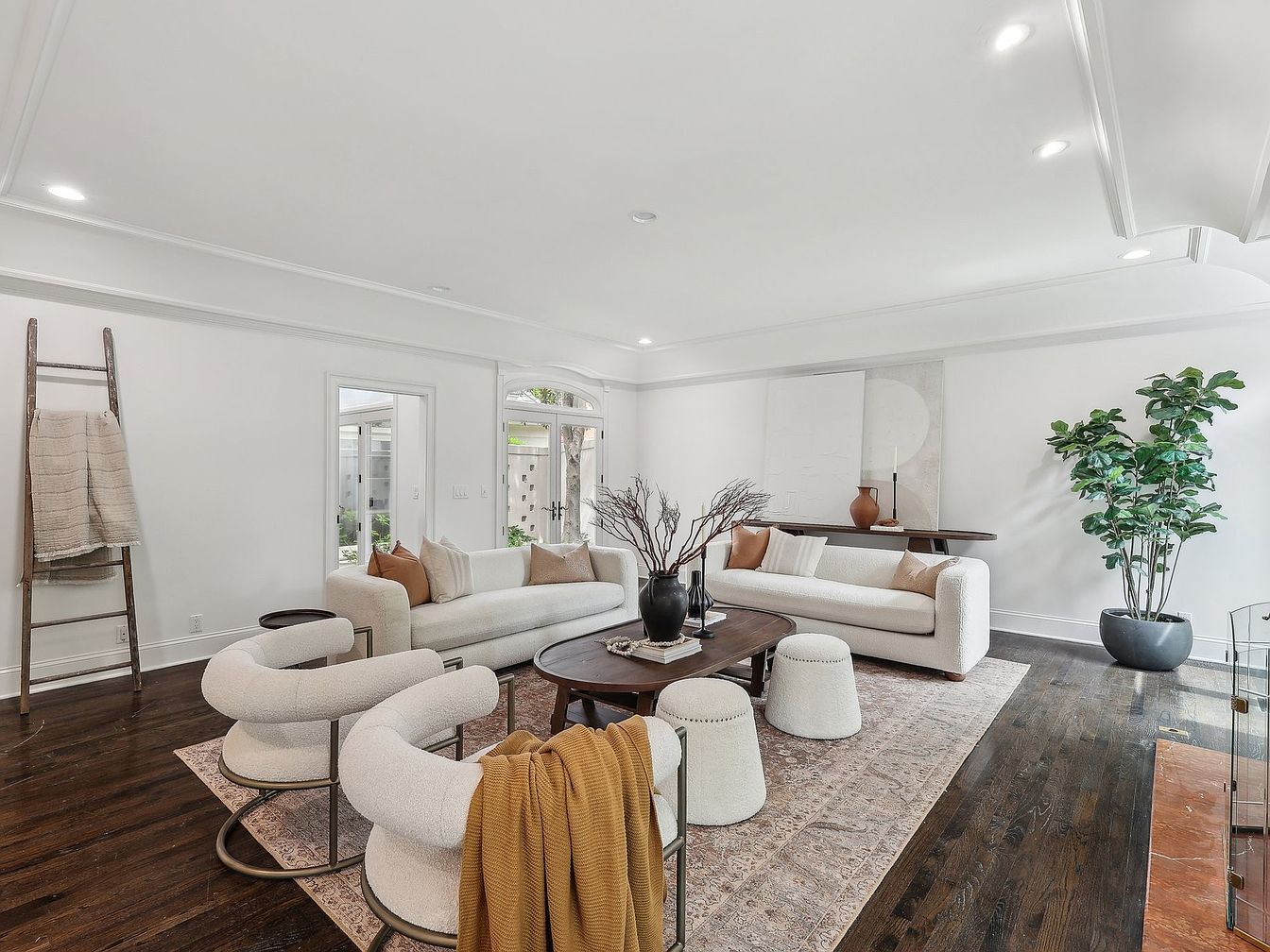 This spacious living room features a serene, neutral color scheme dominated by shades of white and cream, complemented by warm brown accents. Two modern white sofas face each other over a large, muted patterned area rug, anchored by a dark wooden oval coffee table decorated with minimalist vases and bare branches. Plush, rounded armchairs with black metal frames provide additional seating, while two soft ottomans add versatility. The dark hardwood floor contrasts beautifully with the light furniture. Architectural detail includes a coffered ceiling with recessed lighting. The room is brightened by natural light pouring in through a set of glass French doors, and greenery from a tall potted plant adds a fresh touch. A narrow console table against the wall supports minimalist art and decor, creating a tranquil, elegant atmosphere.