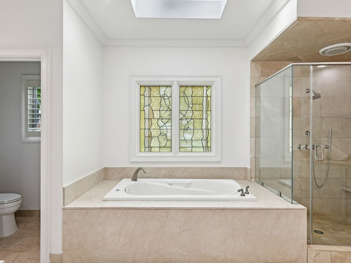 This bathroom showcases a serene and elegant design with a spacious built-in bathtub surrounded by beige marble tiles that extend to the backsplash and tub platform, creating a cohesive and polished look. Above the tub, an artistic stained glass window adds a touch of sophistication and privacy while allowing soft natural light to filter through. Adjacent to the tub is a glass-enclosed shower with matching marble walls and a modern showerhead. The clean white walls and ceiling contrast gently with the warm tones of the marble, enhancing the tranquil atmosphere. A section of the bathroom, including a toilet, is visible through a doorway on the left, maintaining consistent tile flooring.