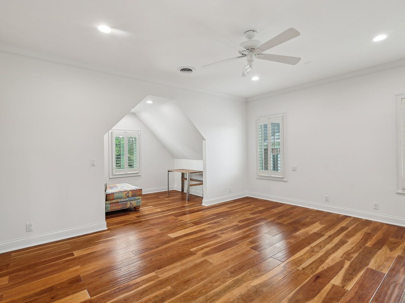 This bright and airy bonus room features smooth white walls and ceiling, contrasted beautifully by rich, warm hardwood flooring that adds a natural, inviting feel. Recessed lighting and a white ceiling fan illuminate and ventilate the space, while two shuttered windows bring in soft natural light. A cozy alcove with angled ceilings offers a nook for a small seating area or workspace, currently furnished with a colorful patterned ottoman and a simple desk. Clean lines, classic trim, and an uncluttered layout emphasize versatility and a fresh, modern aesthetic perfect for various uses.