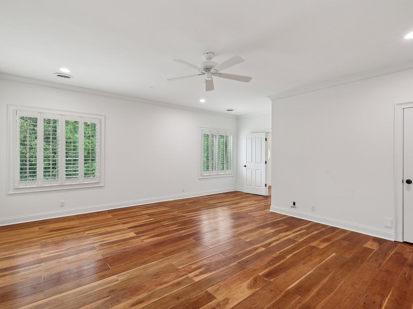 This generously sized bedroom features warm-toned hardwood flooring that adds rich texture and natural beauty to the space. The walls and ceiling are painted in a crisp white, enhancing brightness and creating a clean, minimalist backdrop. Two sets of windows with white plantation shutters invite natural light and offer views of lush greenery outside, contributing to a peaceful ambiance. Crown molding along the ceiling edge and white baseboards provide subtle architectural interest. A white ceiling fan with integrated lighting adds practical comfort. The room’s layout includes two doors, hinting at convenient access to closets or adjoining rooms.