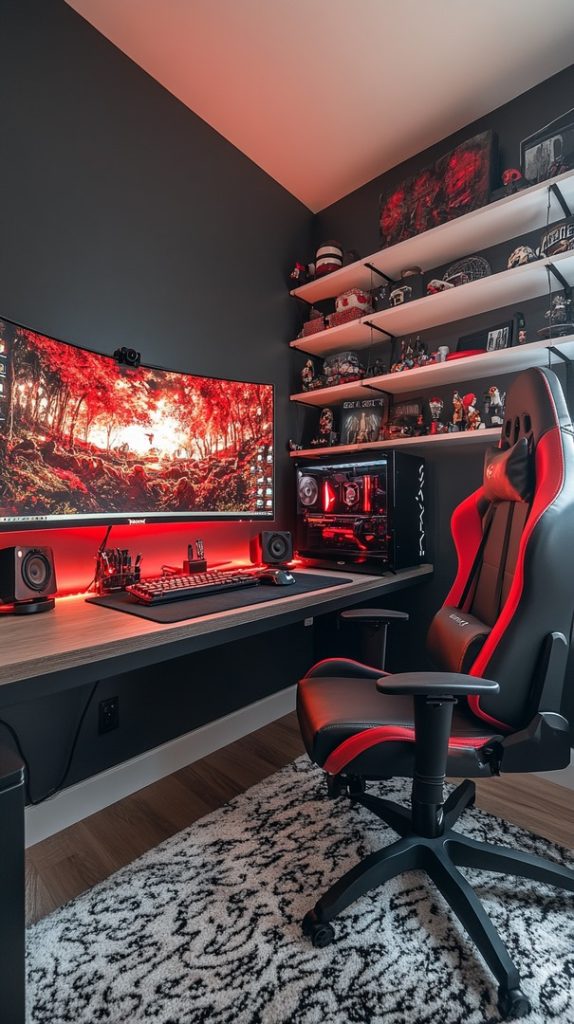 This dynamic gaming setup centers around a bold red-and-black color scheme, creating a high-energy, immersive space. The curved monitor paired with red LED accents sets a dramatic tone, perfect for intense gaming sessions. The sleek black PC tower, equipped with vibrant red lighting, enhances the overall aesthetic, while the racing-style chair ensures maximum comfort for long hours of play. The shelves above the desk feature an array of collectibles and gaming memorabilia, adding a personalized touch to the space. This setup is ideal for gamers who love bold, striking visuals and a high-performance gaming environment.