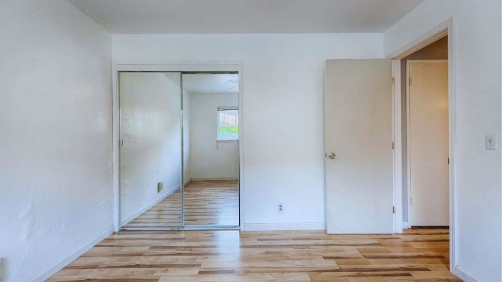 This serene bedroom radiates quiet simplicity, elevated by natural light and clean lines. Crisp white walls reflect the daylight streaming through a modest window, creating a fresh, open atmosphere. The mirrored closet doors expand the sense of space while subtly bouncing light across the room. Underfoot, warm-toned laminate floors introduce a touch of organic texture, grounding the minimalist aesthetic with gentle charm.