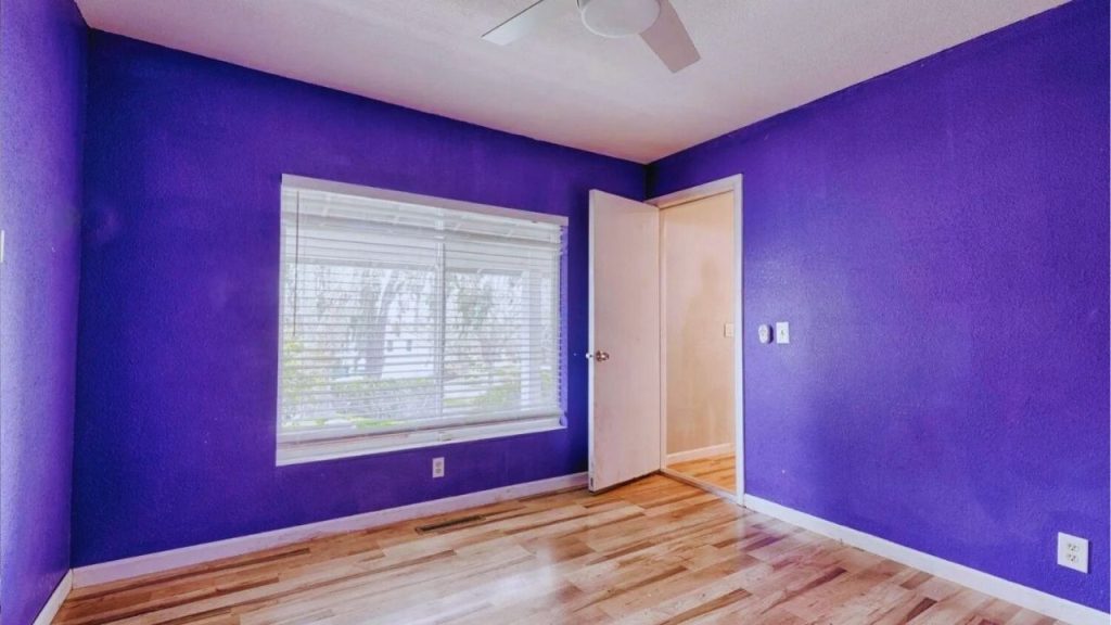 This eye-catching space makes a daring first impression with deep purple walls that bring personality and energy. A large window framed by white blinds offers soft, diffused light, balancing the dramatic palette with a gentle glow. Sleek laminate flooring adds warmth underfoot, while a minimalist ceiling fan brings function without distraction. A perfect room for those unafraid of color and charm.