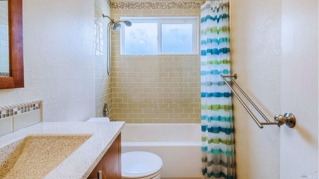 This charming bathroom blends modern simplicity with playful touches. A soft neutral palette is complemented by beige subway tiles lining the shower, finished with a mosaic border for added texture. Natural light filters through a frosted window, brightening the space. The vanity features a speckled stone countertop and warm wood tones, while a striped shower curtain in ocean hues adds a cheerful pop of color.