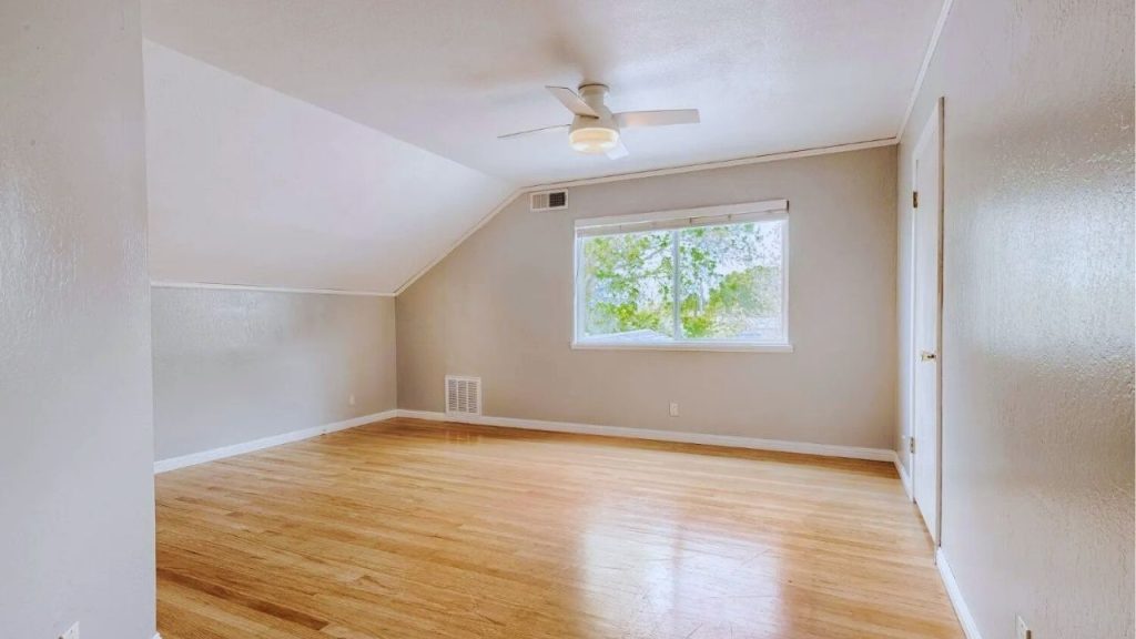 Bathed in soft natural light, this serene upper-level room offers a peaceful escape. A gently sloped ceiling adds architectural interest, while neutral taupe walls and crisp white trim create a calming backdrop. The warm-toned hardwood flooring brings richness and continuity, complemented by a modern ceiling fan overhead. A large window frames views of leafy treetops, inviting the outdoors in.