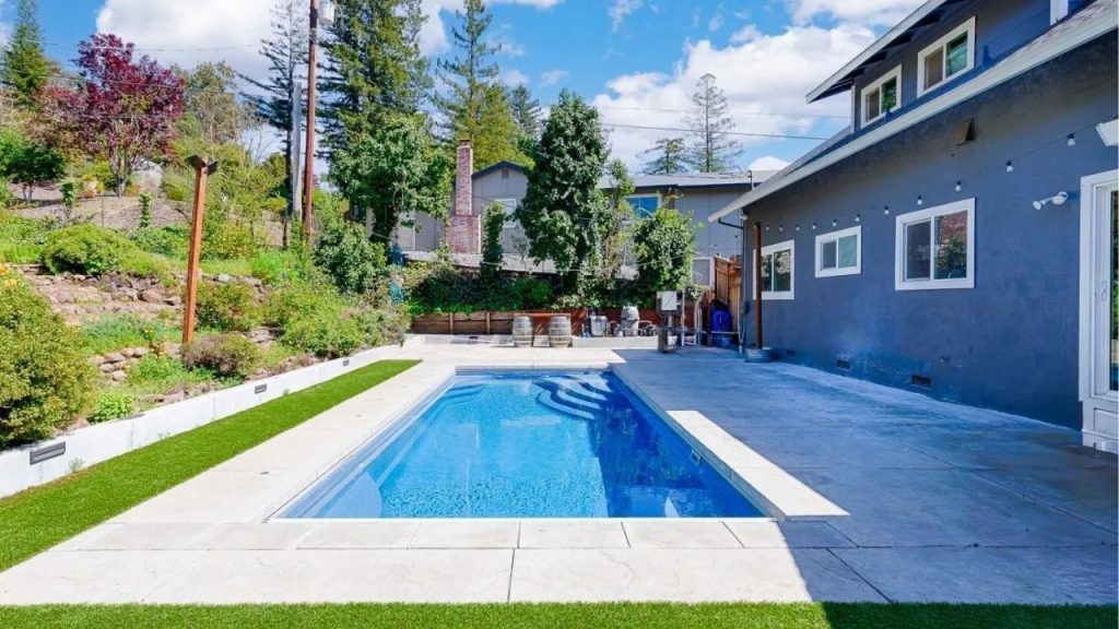 This vibrant outdoor retreat invites relaxation with its sleek rectangular pool framed by crisp concrete and lush artificial turf. The deep blue water mirrors the sky above, while a string of café lights adds evening charm. Terraced landscaping and mature trees offer privacy and a touch of nature. Perfect for lounging or entertaining, the space balances clean lines with a laid-back, resort-style vibe.