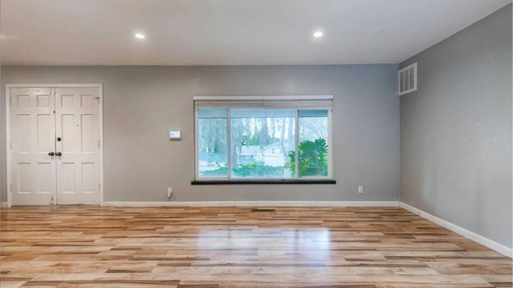 This airy living area balances simplicity and style, featuring soft gray walls and recessed lighting that lend a calm, contemporary tone. Natural light streams through a wide picture window, drawing the eye toward the leafy view beyond. Richly grained wood-look flooring adds warmth and texture, while the double doors provide a classic touch. The open layout invites customization, ready for any design vision.