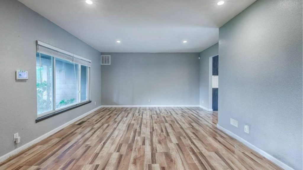 This expansive space is defined by clean lines and effortless flow, perfect for modern living. Soft gray walls and crisp white trim create a neutral backdrop, while wide-plank flooring brings warmth and movement underfoot. Recessed lighting brightens the room from above, and a broad window invites daylight in. The open passage to the kitchen hints at seamless entertaining and everyday comfort.