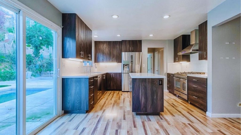 This sleek kitchen balances function and flair with rich, dark cabinetry that contrasts beautifully with smooth white countertops. A central island anchors the space, while stainless steel appliances add a polished edge. Natural light pours in through expansive glass sliders, offering a view of the pool and patio beyond. The warm, striped wood flooring adds movement and texture, tying the room together in modern harmony.