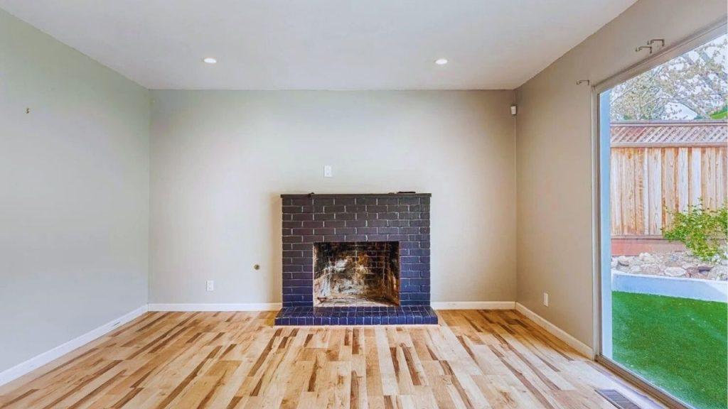 This intimate corner invites comfort with its striking black brick fireplace, offering a bold focal point against soft neutral walls. Recessed lighting above casts a gentle glow, perfect for quiet evenings. A wall of glass to the right frames the fenced backyard and draws in natural light, while the warm, variegated wood flooring grounds the space with natural texture and timeless appeal.
