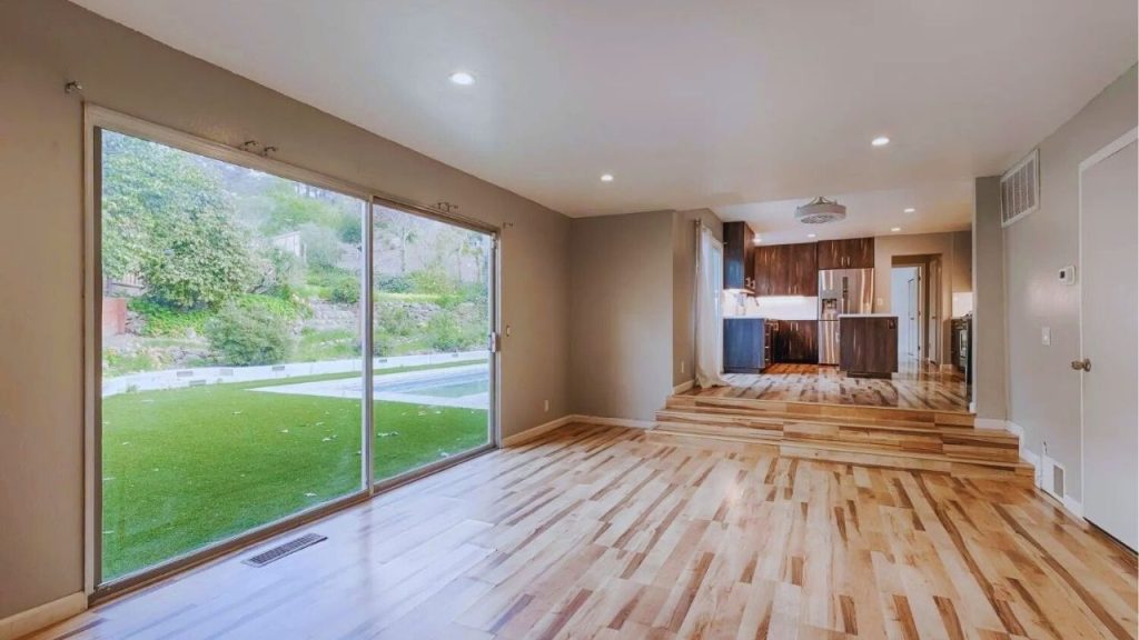 Blending effortless flow with striking views, this open living area steps down from the kitchen to create a subtle yet stylish separation of space. Expansive sliding glass doors flood the room with light and offer a tranquil view of the lush backyard and pool. Consistent wood flooring ties the entire area together, while recessed lighting and warm neutral walls create a versatile canvas for everyday living and entertaining.