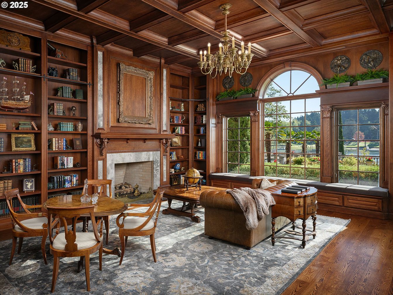 This elegant library space features rich, dark wood paneling and built-in bookshelves framing a classic stone fireplace with intricate molding. A large arched window with divided panes allows natural light to flood the room and showcases a lush garden view. The seating arrangement includes a tan leather chesterfield sofa adorned with a soft throw, a carved wooden coffee table, and a round wooden dining table surrounded by upholstered chairs with classic detailing. An ornate brass chandelier hangs from the coffered ceiling. A patterned area rug anchors the furniture, adding warmth and texture to the polished hardwood floor.