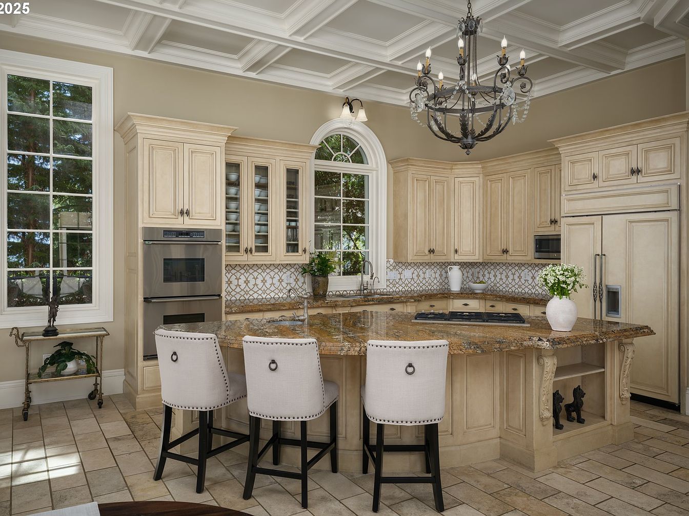 This spacious kitchen showcases a grand island with a polished granite countertop featuring natural earth tones and rich veining, supported by intricately carved corbels. Surrounding cabinetry is finished in a soft cream color with a distressed look, blending seamlessly with a patterned tile backsplash in beige and white hues. The high coffered ceiling adds architectural depth, while an ornate wrought iron chandelier hangs over the island, lending a classic charm. Three upholstered bar stools with studded trim invite seating. Large windows with white trim flood the area with natural light, highlighting the room’s warm and inviting palette.