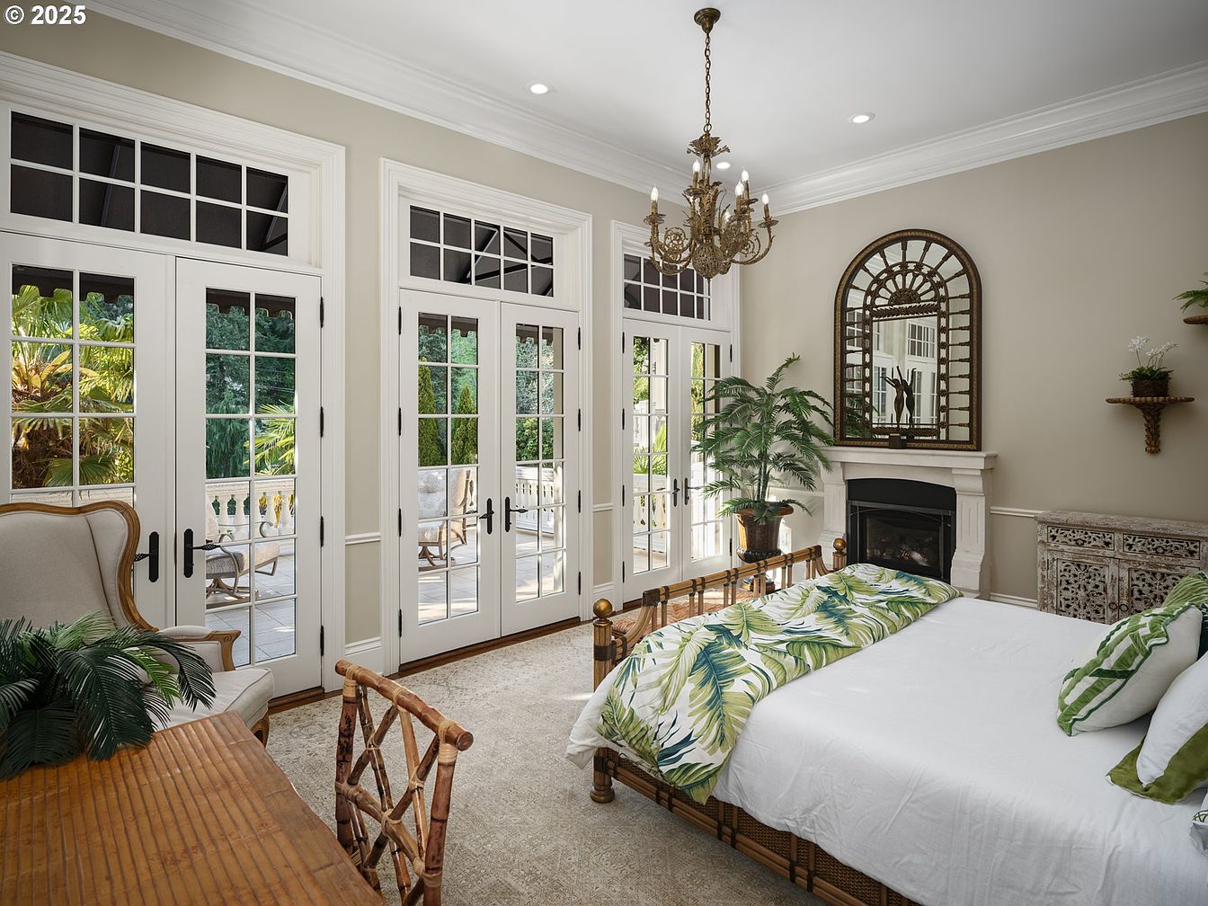 This serene bedroom features a calming neutral palette with beige walls and white trim that highlights the tall French doors leading out to an inviting patio. Natural light floods the space through the large doors and transom windows above, creating a bright and airy atmosphere. The room is furnished with a tropical-themed bedspread in green and white, complementing the lush potted plants on each side of the fireplace. An elegant chandelier hangs from the crown-molded ceiling, while a rustic mirror above the fireplace adds depth and character. The carved wooden sideboard and rattan desk chair enhance the room’s relaxed yet refined coastal vibe.