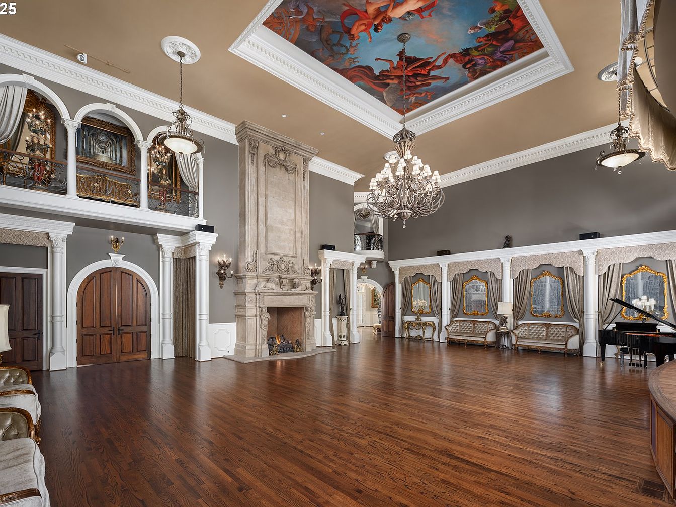 This expansive living room features a regal blend of classical and baroque design elements. The focal point is the towering stone fireplace, adorned with detailed carvings, flanked by ornate wall sconces. The ceiling draws the eye upward with a dramatic painted fresco surrounded by intricate crown molding, illuminated by an elegant chandelier. The space is framed by arched openings with decorative columns and wrought iron railings on the balcony above. Rich, dark hardwood floors balance the warm taupe walls and soft cream accents. Luxurious tufted seating and gilded mirrors enhance the sophisticated atmosphere, complemented by a grand piano on the far right.