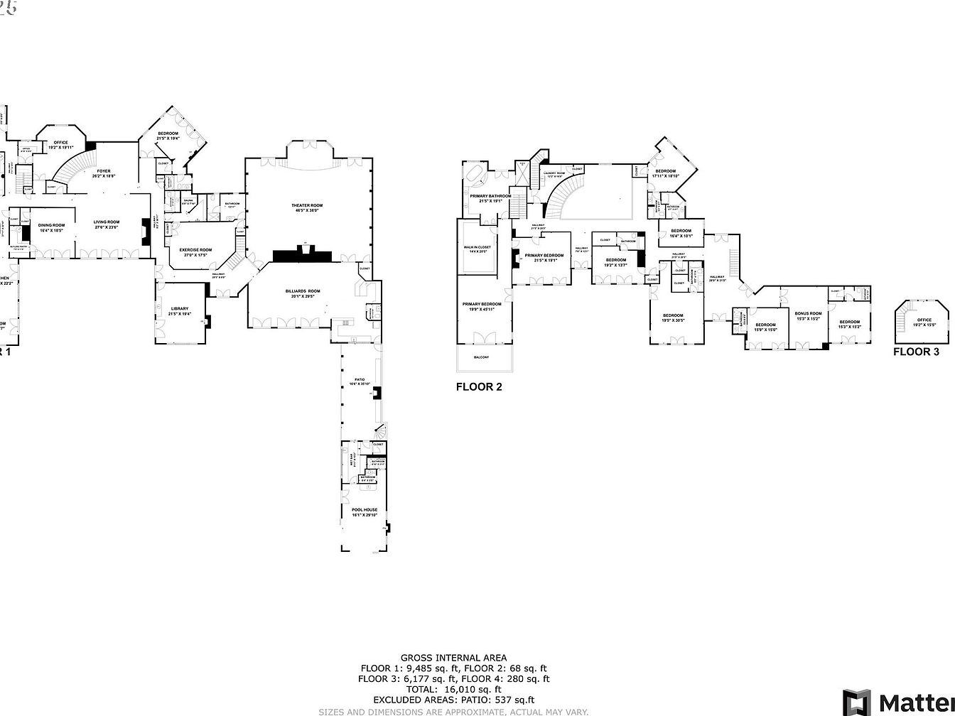 This detailed multi-floor layout highlights an expansive residence marked by distinct zoning for living, entertainment, and private areas. The first floor features grand common spaces including a spacious living room, dining room, library, and multiple recreational rooms like a theater and billiards room, connected by hallways and staircases. The second floor prioritizes privacy with multiple bedrooms, including a large primary suite with an adjoining luxurious bathroom and walk-in closet, along with secondary bedrooms and bathrooms. The uppermost floor serves as a bonus and office space zone. The plan also includes outdoor patio and pool house designs, offering a comprehensive flow for both social and personal functions.