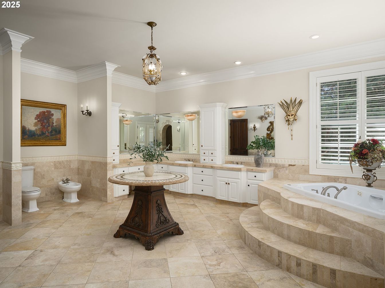 This spacious master bathroom features a cohesive beige and cream color palette, highlighted by polished stone tiles covering the floor and lower wall. A large built-in tub is elevated with wide stone steps, offering a luxurious soaking experience near a window with white plantation shutters. The room includes expansive white cabinetry with a granite countertop, accompanied by three mirrors and elegant bronze fixtures. In the center, a decorative round table with ornate wooden legs adds a refined touch. Classic crown molding, tasteful wall sconces, an antique chandelier, and tasteful artwork complete the sophisticated and warm ambiance.