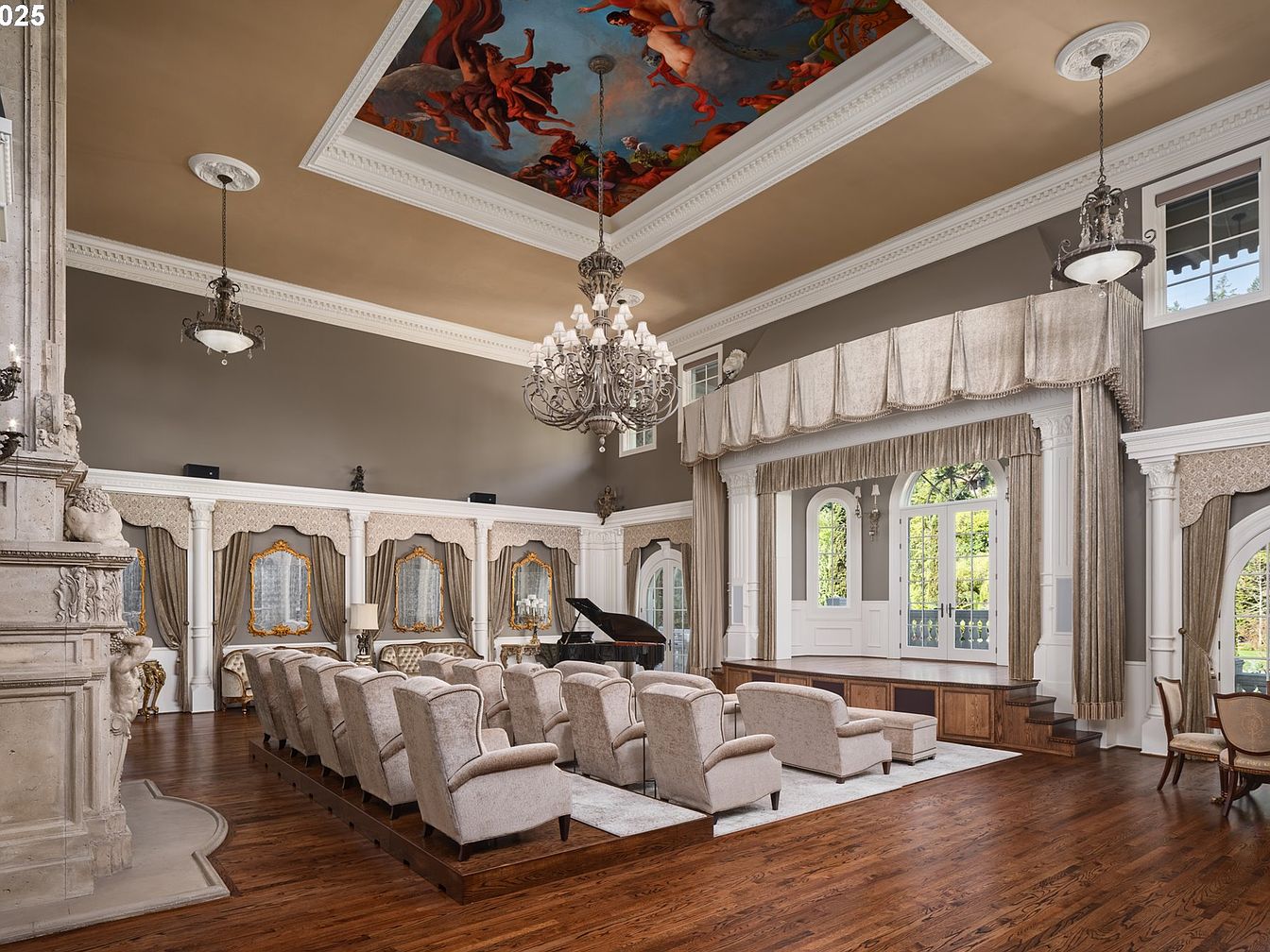 This grand formal living room features a raised seating area with plush, beige armchairs and matching sofas arranged in rows facing a slightly elevated stage area framed by elegant drapery. Rich, polished hardwood flooring complements the muted taupe walls, which are contrasted by white intricate crown moldings and classical columns. The ceiling showcases a dramatic, colorful fresco surrounded by ornate white trim, while a large, intricate chandelier commands attention in the center of the room. Floor-to-ceiling windows with graceful curtains allow natural light to flood the space, enhancing its stately and refined ambiance.