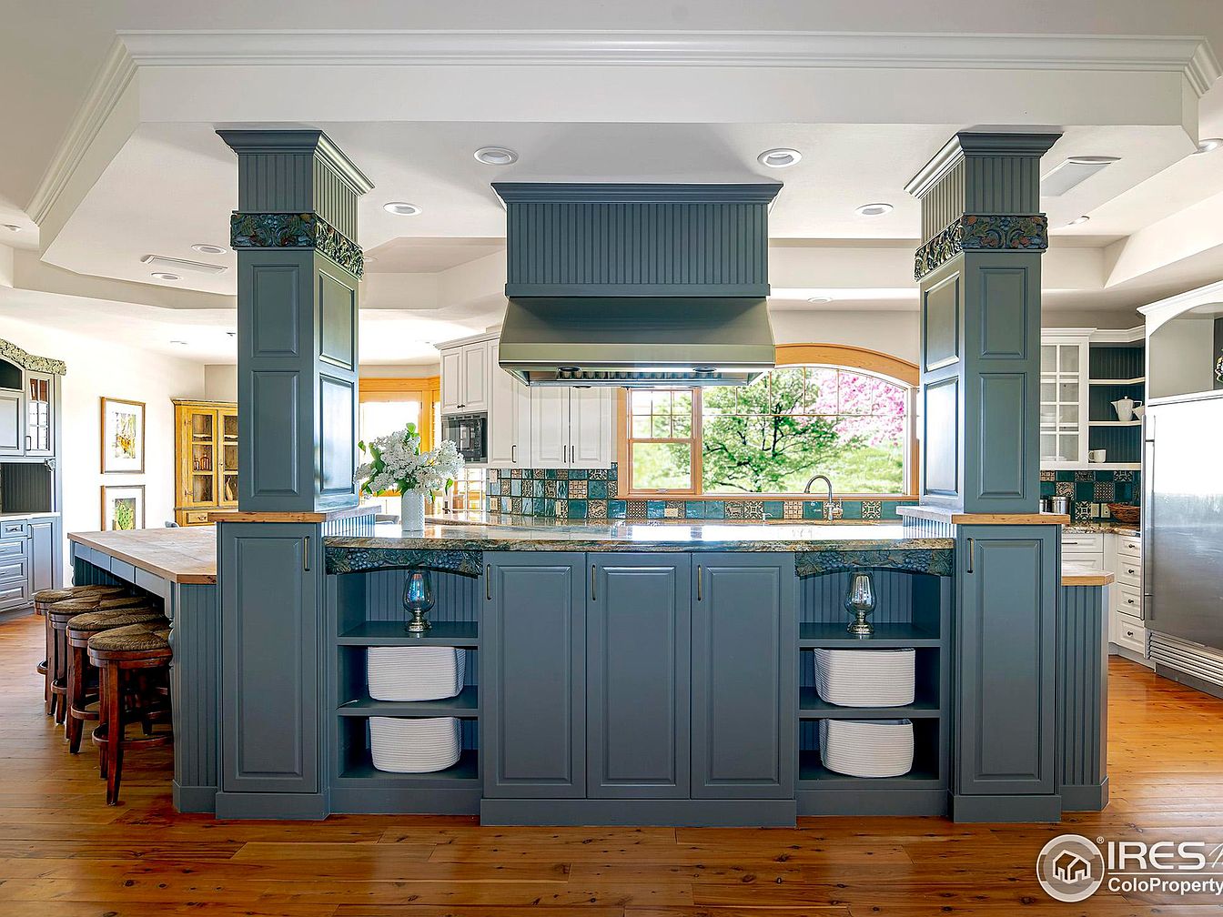 This spacious kitchen centers around a large island painted in a muted blue-gray, featuring paneled details and open shelving on either side stocked with white dishware. The island is topped with a polished granite countertop, which extends to create a breakfast bar with rustic wooden stools tucked underneath. Flanking the island are two structural pillars with decorative floral molding near the top, adding character and a touch of elegance. Behind, the backsplash presents a vibrant patchwork of multicolored tiles, harmonizing with the natural wood window trim that frames a large arched window, allowing abundant natural light to flood the space. The wooden floor adds warmth, contrasting beautifully with the cooler blue cabinetry. The overall ambiance balances rustic charm and classic sophistication.