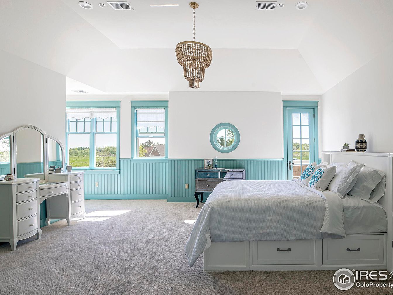This spacious master bedroom embraces a soft and airy aesthetic with light turquoise wainscoting running midway along the walls, set against crisp white upper walls and ceiling. Large windows framed in matching turquoise allow ample natural light to flood the space, highlighting the plush, light gray carpet. A white bed with built-in storage drawers anchors the room, complemented by white and turquoise accent pillows. Opposite the bed, a vintage vanity with three mirrors provides both function and charm. The ceiling is adorned with a wooden bead chandelier, enhancing the subtle coastal vibe throughout this serene retreat.