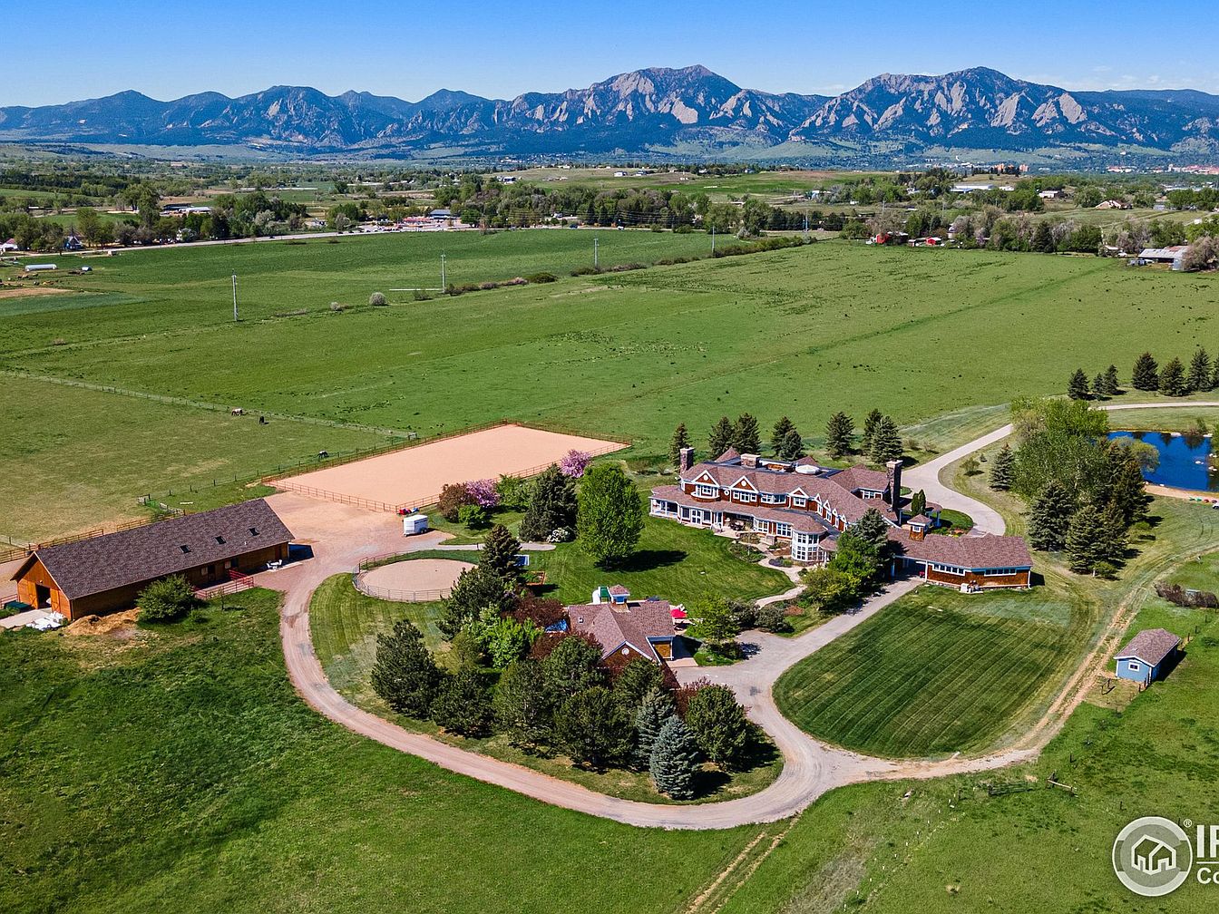 This expansive estate is nestled in a sprawling rural landscape with breathtaking mountain views in the background. The property features a grand main residence with classic architectural details, a warm brown roof, and multiple chimneys. The driveway curves gracefully through lush, well-maintained lawns and clusters of mature trees, leading to various outbuildings including a barn and riding rings, hinting at equestrian amenities. The estate blends natural beauty with cultivated green spaces, combining rustic charm and refined elegance within a serene countryside setting, ideal for a luxurious yet peaceful lifestyle.