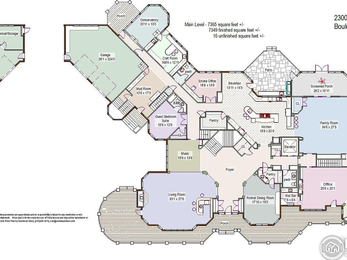 This expansive main level covers 7,365 square feet, showcasing a sophisticated layout with multiple functional zones. The design features a grand foyer centrally located, surrounded by prominent rooms including a large living room with an adjoining porch, a formal dining room, and a spacious family room that opens to a screened porch. The kitchen, designed with ample counter space and a breakfast nook, connects fluidly to a patio and pantry areas for convenience. Additional rooms include a versatile office, music room, guest bedroom suite, craft room, estate office, and mudroom. A garage and elevator add to the home’s accessibility and practicality.