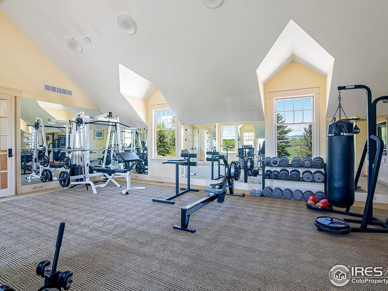 This spacious home gym features an open layout with light cream walls and a high, angled ceiling that creates an airy atmosphere. Large windows with pointed architectural frames allow natural light to fill the room and offer scenic outdoor views. A full wall of mirrors enhances the sense of space and reflects the exercise equipment, including a weight machine, rowing machine, dumbbell racks, and a heavy punching bag. The neutral-toned patterned carpet adds warmth and comfort, making this room a well-equipped, inviting place for fitness and training activities.