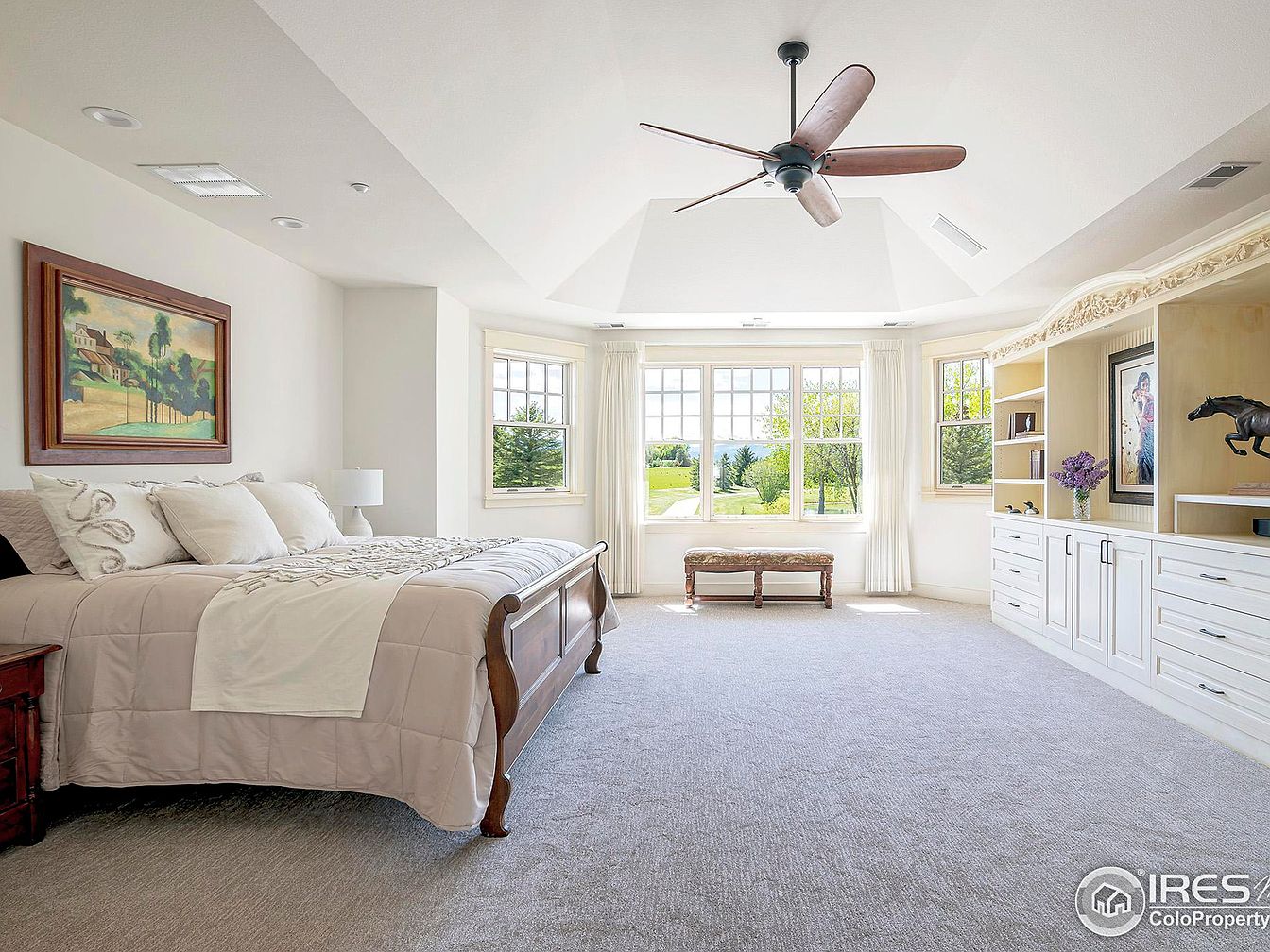 This spacious master bedroom features a high vaulted ceiling with a modern ceiling fan, enhancing airflow and openness. The neutral palette centers around soft whites and beige tones, complemented by a large wooden sleigh bed with neutral bedding. A classic landscape painting hangs on the wall above the bed, adding warmth and character. The room is brightly lit by a trio of large windows framed in white, offering a serene view of lush greenery outside. Opposite the bed, an expansive built-in cabinetry unit includes shelves and cabinets with intricate molding, decorated with art, books, and fresh flowers for a touch of personality and elegance. A cushioned bench sits beneath the middle window, inviting peaceful moments and natural light throughout the space. Plush carpeting covers the floor, adding comfort and softness to the overall serene atmosphere.